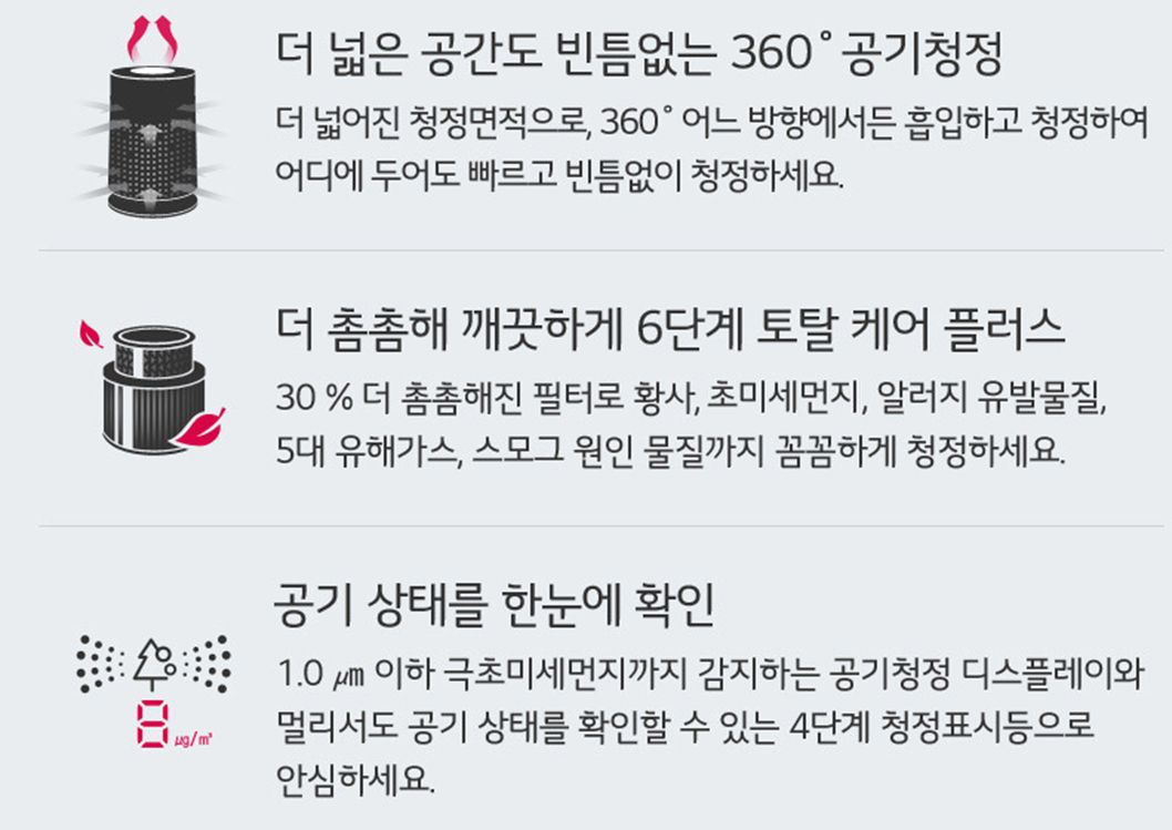 엘지퓨리케어는 360˚의 공기 청정으로 어디에 두어도 빠르고 빈틈없이 청정이 가능하며 더 촘촘해진 필터로 황사, 초미세먼지, 알러지 유발 물질 5대 유해가스, 스모그 원인 물질까지 꼼꼼하게 청정이 가능합니다.